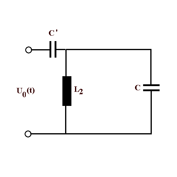 Bei großen Frequenzen überwiegt der induktive Widerstand iωL2 der Schwingkreisspule. Die Spannungsteilerschaltung besteht aus den kapazitiven Widerständen -i/ωC' und -i/ωC. Es bildet sich eine Schwingkreisspannung aus, die sich bei großen Frequenzen verhält wie U0 1/C / (1 /C + 1/C') = U0 C'/( C + C') = U0 k/(1 + k ), wobei k = C'/C.
