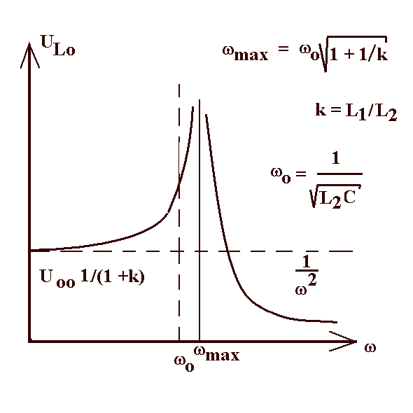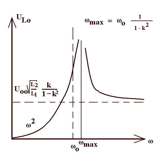 UL0 = iω·L2·I20 = iω·L2 · U00 / (ω·M[ 1/k 2( ω02/ω2 - 1 ) + 1 ]) = i·L2·L1/ML1 U00 / [ 1/k 2( ω02/ω2 - 1 ) + 1 ] = i √L2/L1 · U00 · k / [ ( ω02/ω2 - 1 + k2 ]