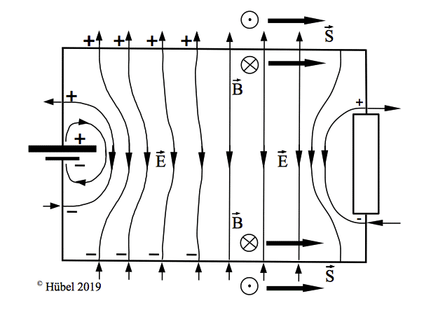 allem in seiner Nähe, innerhalb und außerhalb der Leiterschleife. Hier werden widerstandslose Stromzuführungen zum Widerstand angenommen. Deshalb münden die elektrischen Feldlinien senkrecht auf der Wandung der Leitungen. (2) Die Energie wird nicht in den Leitern transportiert; die fließenden Ladungen vermitteln nur den Transport der Energie. Sie erzeugen ein Magnetfeld, das zusammen mit dem elektrischen Feld statischer Oberflächenladungen auf den Stromzuführungen den Energietransport längs S vermittelt, unabhängig von der Stromrichtung. |