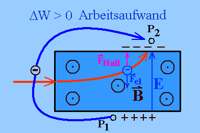 An einem Punkt P1 habe eine Ladung eindeutige Energie, das Magnetfeld sei auf den Bereich des Hall-Plättchens beschränkt, das es senkrecht durchsetze. Bringt man die Ladung zu einem Punkt P2 auf der gegenüberliegenden Seite des Plättchens, die sich durch die Lorentzkraft negativ aufgeladen hat, dann ist die dazu nötige Arbeit abhängig davon, ob man die Ladung außerhalb des Hall-Plättchens/Magnetfelds oder durch das Plättchen zu P2 verschob.