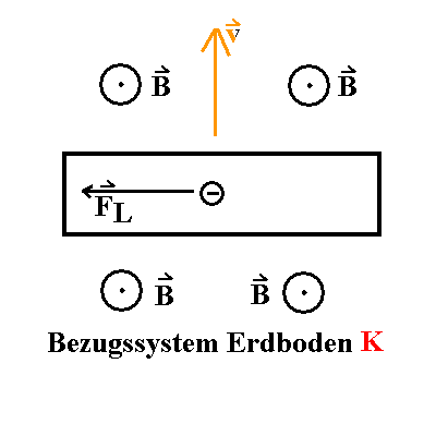 Vom Tower aus sieht die Situation so aus: Wir betrachten das elektrisch isolierte Flugzeug. Im BZS K gibt es ein magnetisches Feld B. Mit den Flügeln des Flugzeug werden Elektronen mitgerissen, Geschwindigkeit v in Bewegungsrichtung des Flugzeugs. Es folgt eine Lorentzkraft zu einer der Flügelspitzen hin. Elektronen im Metall der Flugzeughülle werden in ihre Richtung gezogen. Die in Flugrichtung linke Flügelspitze lädt sich negativ auf, die andere positiv. Dadurch entsteht ein (statisches) elektrisches Feld E, bis sich Lorentzkraft und elektrische Kraft gegenseitig aufheben. Dann ist die Ladungsverschiebung beendet. Dieses Feld E im Inneren des Stabs muss wegen des Kräftegleichgewichts homogen sein und entspricht damit dem idealen Feld eines Plattenkondensators. Im Erdsystem K könnte die Aufladung der Flügelspitzen durch eine elektrische Spannung U = E·ℓ gemessen werden, wenn ℓ die Spannweite der Flügel ist. Dabei wollen wir uns jetzt nicht um das Vorzeichen der Spannung kümmern. Allerdings ist das beim Flugzeug technisch unmöglich, weil die Flügelspitzen nicht auf Drähten gleiten. So wird man im Erdsystem K die Überlegung nicht überprüfen können. Dieselben Überlegungen gelten aber auch für einen beliebigen im Magnetfeld bewegten Stab, bei dem eine solche Messung realisiert werden kann. Nutzen wir das Kräftegleichgewicht (KGG) zwischen der Lorentz-Kraft und der sekundären elektrischen Kraft: q· v x B = - q·E (q sei die Ladung eines Leitungselektrons; beide Kräfte nur dem Betrag nach gleich; entgegengesetzt), also E = - v x B, gleichgerichtet mit der Lorentzkraft im Inneren des Stabs. Das ist das sekundäre elektrische Feld, das sich als Folge der Ladungstrennung ausbildet. Zwischen den Flügelspitzen bildet sich also die Spannung U = E· ℓ = B· v· ℓ aus. Hier muss die übliche schulisches Argumentation enden.