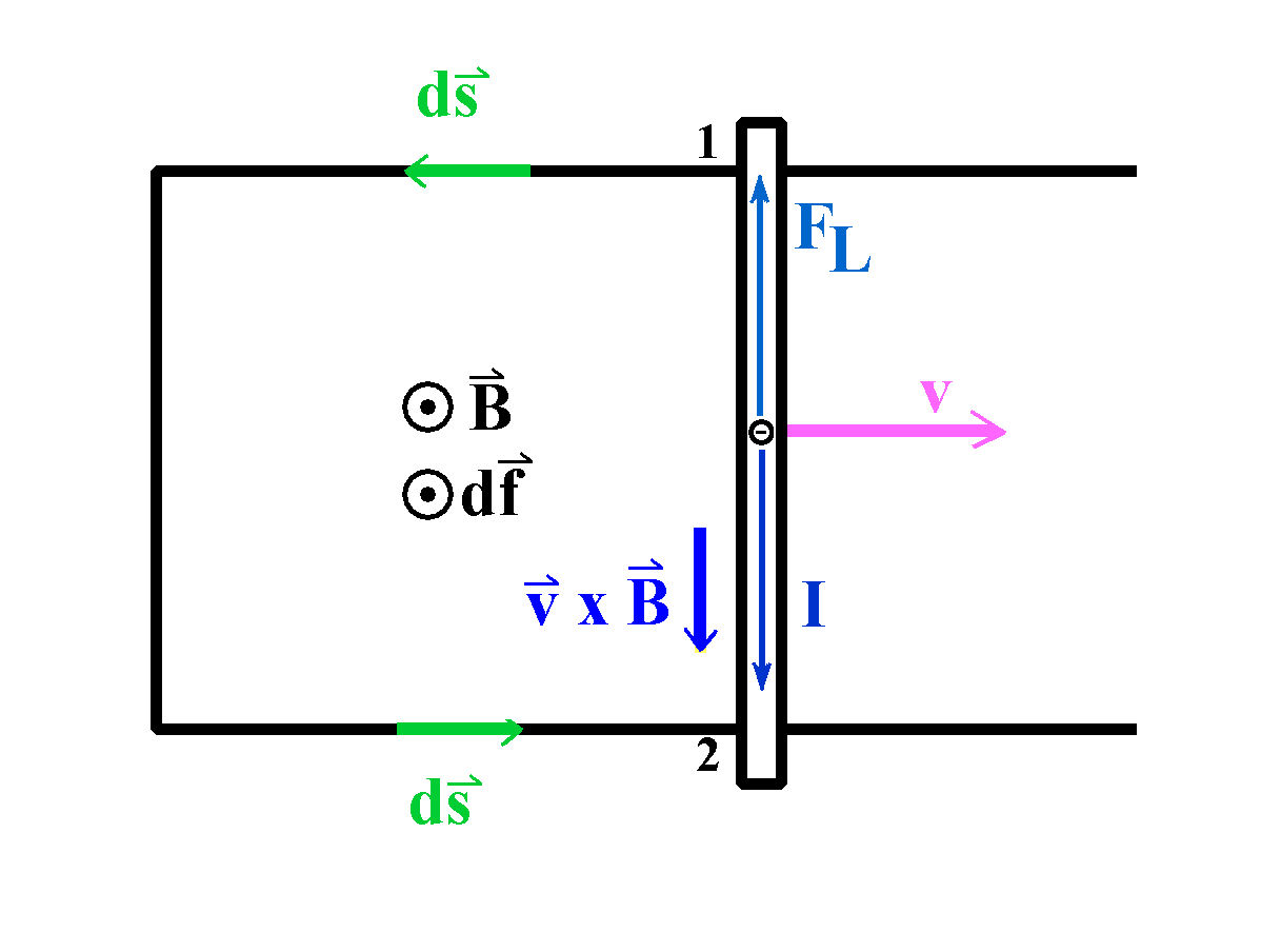 Geschlossener Leiterkreis: Weil v x B überall verschwindet, außer in der bewegten Leiterbrücke, reduziert sich die Ringspannung hier auf ein gewöhnliches Integral: URing = ∫ von 2 nach 1 (v x B · ds) v x B ist längs des I-Pfeils (in der Zeichnung nach unten) gerichtet, also entgegengesetzt zu ds. Es ergibt sich also URing = - B·v·L, wenn L die Länge der Leiterbrücke ist. Das negative Vorzeichen besagt: Das elektromagnetische Feld verrichtet negative Arbeit um eine positive Ladung in Richtung v x B zu verschieben (also einen Strom I zu erzeugen), benötigt also Energiezufuhr von außen für diesen Induktionsvorgang. Es lässt sich begründen, dass dazu eine äußere Kraft Fext in Richtung v ausgeübt werden muss. Mit der Flussregel geht es auch: Bei dieser Orientierung von B, df und v nimmt der eingeschlossene magnetische Fluss im Laufe der Zeit zu um B·v·L. Die Ringspannung ist also URing = - dΦ/dt = - B·v·L |