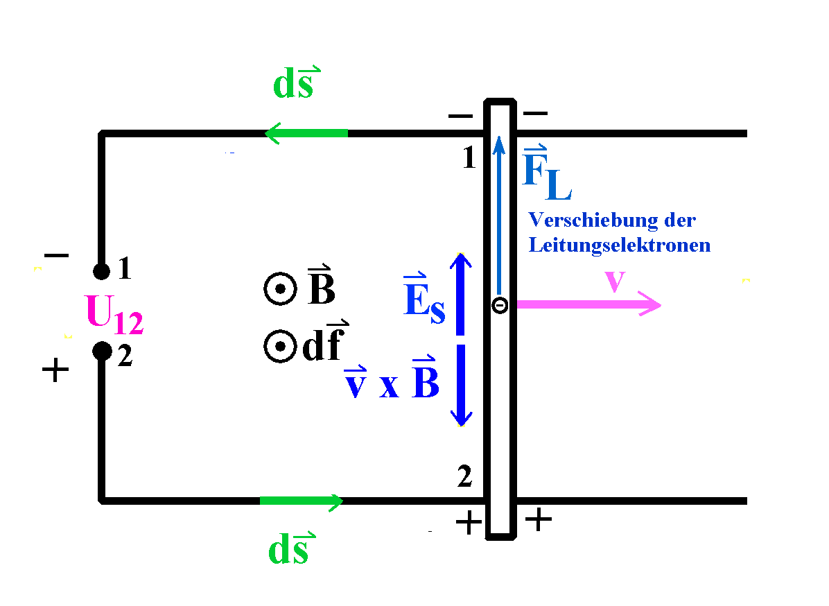 - URing = ∫0 (( E + v x B ) · ds) = - dΦ/dt , URing = U12 = dΦ/dt und URing = I · R . Das hätte einige weitere Vorzeichenänderungen zur Folge gehabt. )