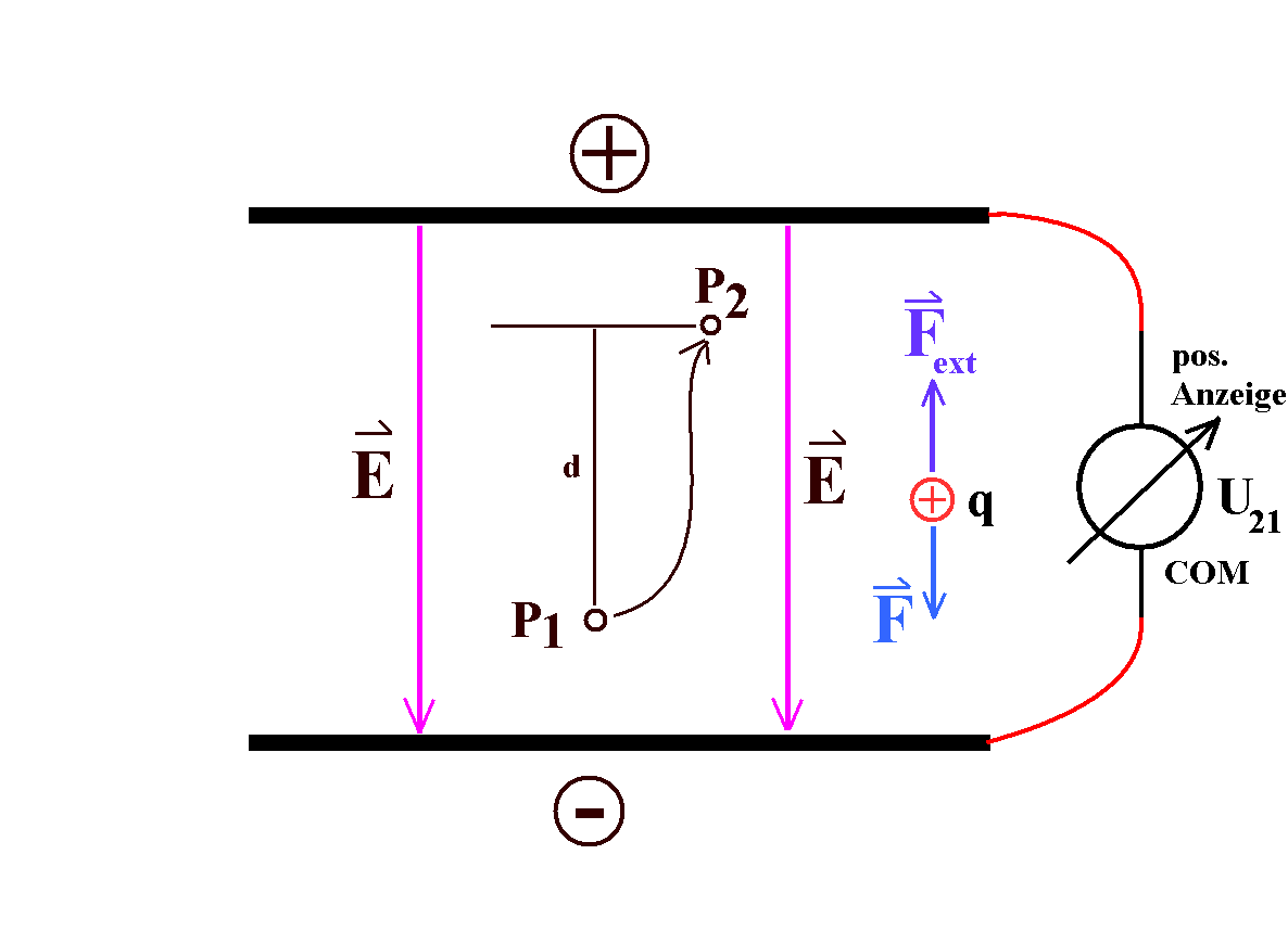 Nach Konvention 2 ist die Spannung U12 am positiven Pol im Vergleich zum negativen Pol negativ! Das Feld verrichtet negative Arbeit, d.h. es muss von außen positive Arbeit zugeführt werden, wenn es eine positive Probeladung von der negativen zur positiven Platte verschiebt. Die Spannung U21 am negativen Pol ist dann im Vergleich zum positiven Pol positiv. U21 nach Konvention 2 wird von einem Spannungsmesser richtig angezeigt, wenn sein Massepol (COM) mit dem Minuspol verbunden wird.