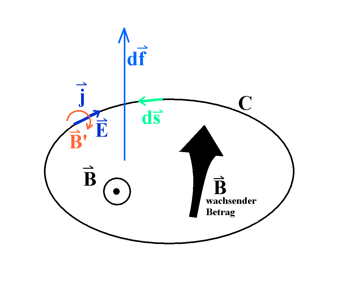 a) In einem geschlossenen Stromkreis mit einem Gesamtwiderstand R > 0 ist die Folge der Ringspannung ein Stromfluss in Richtung von E (für die Stromdichte j gilt häufig nach dem Ohm'schen Gesetz j = σ ·E) längs der Kurve C, wenn C also mit einem Leiterring belegt ist. Es gilt also