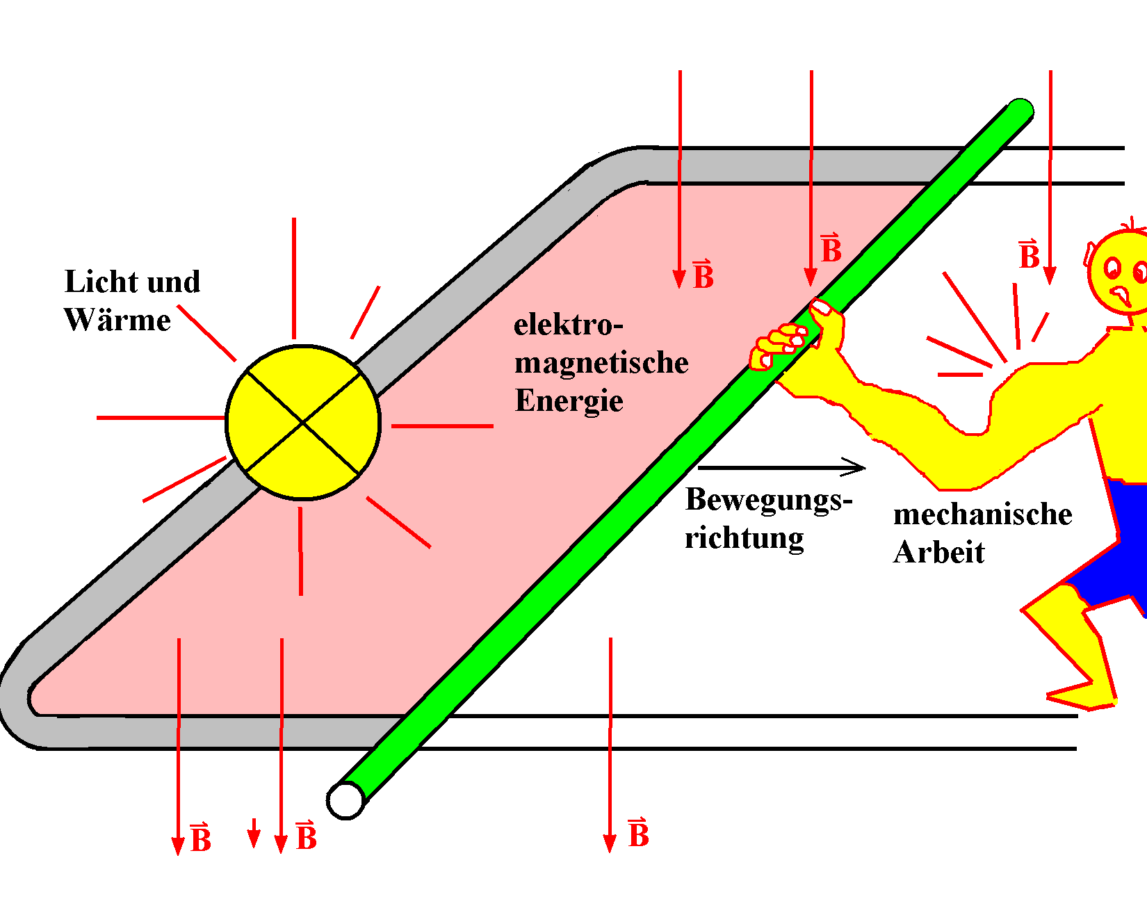 Bei diesem einfachsten Typ eines Generators wird mechanische Arbeit mittels der Induktion in elektromagnetische Energie umgewandelt, die schließlich durch ein Lämpchen als Licht und Wärme abgestrahlt wird. Diese Erscheinung, dass in Generatoren durch Induktion mechanische Arbeit in elektromagnetische Energie umgewandelt wird, ist einer der Gründe für die überragende Bedeutung der Induktion. (rosa in der Zeichnung: von der geschlossenen Kurve umfasster magnetischer Fluss. Er ändert sich mit der eingeschlossenen Fläche, wenn die grüne Leiterbrücke verschoben wird.) |