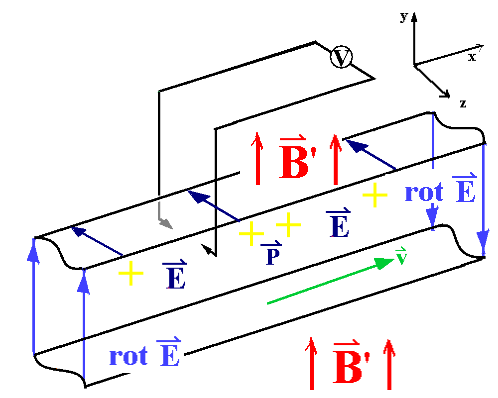 (3) Wie hier gezeigt wurde, kommt es bei einem in x-Richtung unendlichen magnetisierten Stab zu keinem elektrischen Wirbelfeld (die elektrische Polarisation erzeugt ein wirbelfreies elektrisches Feld), sehr wohl aber zu einer Ringspannung infolge der Lorentz-Kraft und damit zur Induktion. Die Lorentz-Kraft führt zu einer Ringspannung, weil sie auf den Bereich des Magneten beschränkt ist. Es handelt sich dann um eine Unipolar-Induktionsmaschine.
