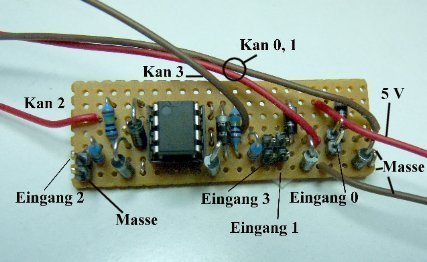 Die Kanäle ADC 0 und ADC 1 werden von uns für Gleichspannungen vorgesehen, die Kanäle ADC 2 und ADC 3 für Wechselspannungen. Mit den übrigen 4 Analog-Wandler-Kanälen können Sie machen, was Sie wollen.