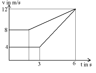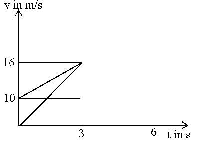 c) Dann werden für einen Überholvorgang mit konstanten Beschleunigungen die zwei Graphen rechts vorgegeben. Die Schüler sollen kreativ eine Story dazu erfinden mit Werten aus dem Diagramm (Gruppenarbeit). Z.B.: Gerade als die Ampel von rot auf grün umschaltet, wird ein an der Ampel stehender PKW A von einem PKW B überholt. Dieser hat beim Überholen die Geschwindigkeit 10 m/s. Nach 3 Sekunden haben beide PKWs die gleiche Geschwindigkeit 16 m/s. Ob alle Schüler es schaffen zu erkennen, dass hier kein 2. Überholvorgang beschrieben wird? In meiner 11. Klasse fielen immerhin 2 Schüler darauf herein. In meiner 11. Klasse wurde auch ein vertikaler Wurf nach unten vorgeschlagen. Die Anfangsgeschwindigkeit sollte erreicht werden, indem der Stein nach unten geworfen wird, während der andere aus der Ruhe startet. Heftige Diskussion entstand, als einige der Schüler die unterschiedliche Beschleunigung durch unterschiedliche Massen erklären wollten. Andere Schüler verbesserten und erklärten sie mit unterschiedlicher Luftreibung: Heftige Diskussionen, die Probleme aufgeworfen haben, die aber nur für einen Teil der Klasse gleich geklärt werden konnten. d) Der Graph soll jetzt gelesen werden: Wann etwa hat das anfangs schnellere Auto die doppelte Geschwindigkeit im Vergleich zum anderen? Wie groß sind die beiden Beschleunigungen? Welches Fahrzeug beschleunigt stärker? Wann ist das anfangs ruhende Fahrzeug doppelt so schnell wie das andere? i) Kreativ eine Story erfinden: Wie könnten die Graphen weiter verlaufen, was passiert entsprechend dieser Fortsetzung des Graphen? Hier sind alle Möglichkeiten offen. Indem die Schüler sich für eine Möglichkeit entscheiden, klären sie diese eine Situation. Die vielen Varianten in der Klasse führen zu heftigen Diskussionen.