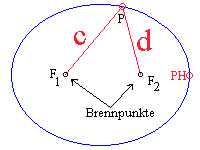 | Eine Ellipse ist der geometrische Ort aller Punkte P, die von 2 verschiedenen Punkten F1 und F2 zusammen konstanten Abstand haben (c + d = konst ). |