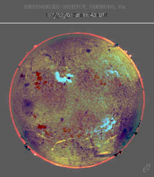 Sonnenfotos im Halbjahresabstand, nämlich vom 13.7.1998 und vom 1.12.1997 (aus dem Internet: "Kiepenheuer-Institut für Sonnenphysik, KIS"). Durch die Bildbearbeitung sind auch die Farben verändert worden, so dass man den Kontrast zwischen beiden Bildern besser sieht.