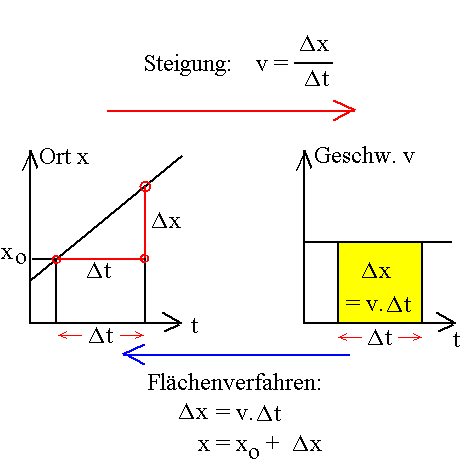 Es gibt auch einen Weg vom t-v-Diagramm zur Ortsänderung Δx = v · Δt: das "Flächenverfahren". Bei konstanter Geschwindigkeit entspricht die Ortsänderung Δx in einem Zeitintervall Δt der Fläche unter dem t-v-Graphen. Von der Ortsänderung Δx kommt man zum Ort x, wenn man den Anfangsort x0 zu Beginn des Zeitintervalls hinzu addiert (Es handelt sich um eine "Integration". In der Schule nenne ich sie (zunächst) "Flächenverfahren"):