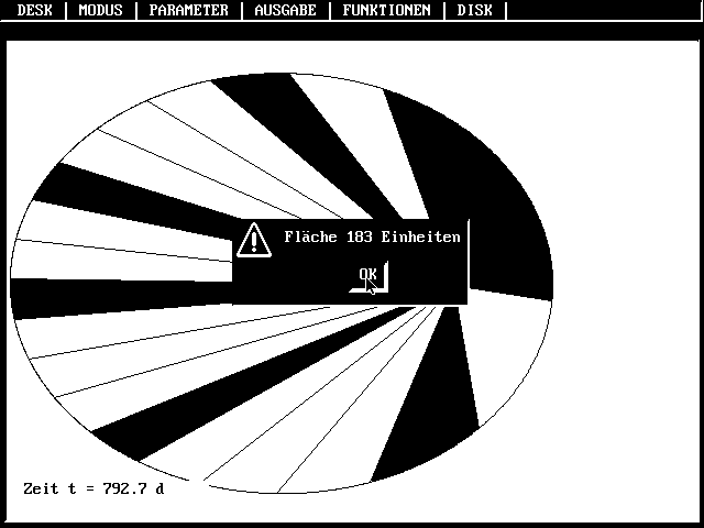 Erfragt den Zeitschritt für die Simulation. Je größer die Exzentrizität e der Bahn, desto mehr Schritte pro Umlauf werden benötigt. Verändert man den Zeitschritt von Planet zu Planet, dann vermittelt die Dauer der Simulation einen falschen Eindruck von der Zeitdauer der Realbewegung. Obwohl fast kreisförmige Bahnen schon mit wenigen Zeitschritten ausreichend gut berechnet werden können, empfiehlt es sich doch, angepaßt an die Rechnergeschwindigkeit stets gleichgroße Zeitschritte zu verwenden. Es wird jedoch immer die Realzeit angezeigt und nur diese ist für die Ableitung der Kepler-Gesetze zu verwenden.