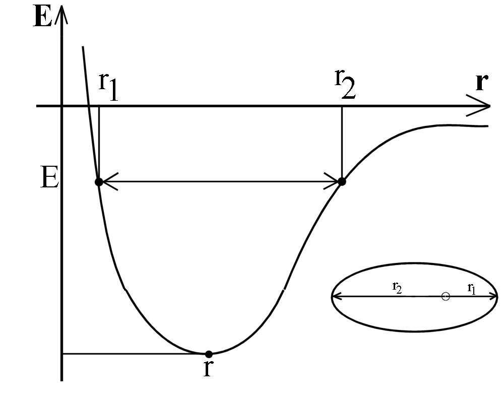 | Effektives Potenzial aus Gravitationspotenzial und "Zentrifugalpotenzial": Abhängigkeit vom Radius. An den "Umkehrpunkten" (bei den Radien r1 und r2) ist die Radialgeschwindigkeit 0. Dazu passen die entsprechenden Positionen auf der Kepler-Ellipse. |