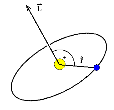 2. Die Bahnkurve verläuft in einer Ebene. Die Lage dieser Ebene kann durch einen "Flächenvektor" gekennzeichnet werden, der auf dieser Ebene senkrecht steht (im Bild längs L). Es gibt offenbar keine Kraftkomponente und keine Geschwindigkeitskomponente, die den Planeten aus dieser Ebene herausführt. 3. Die Sonne steht nicht im Zentrum der Ellipse, sondern in einem ihrer Brennpunkte. (Auch ein Kraftgesetz nach Hooke könnte als eine der möglichen Bahnkurven eine Ellipse liefern, aber mit dem Kraftzentrum im Zentrum der Ellipse.) |