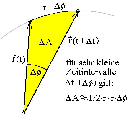 Wenn man mit Hilfe der Bogenlänge b = r·Δφ für sehr kleine Zeitintervalle Δt bzw. sehr kleine Winkeländerungen Δφ die vom Fahrstrahl überstrichene Fläche ansetzt, erhält man ungefähr ΔA = 1/2·r·r·Δφ (1/2 x Radius x Bogenlänge). Damit ergibt sich ΔA/Δt = 1/2 · r2 · ω mit der Winkelgeschwindigkeit ω = Δφ/Δt. Entsprechendes gilt auch im Limes Δt => 0. |