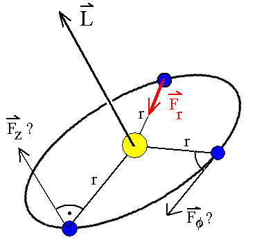 Zu einer radialen Komponente der Kraft würde verschwindender Hebelarm gehören. Sie kann also keinen Beitrag zum Drehmoment liefern, wohl aber eine z-Komponente (r·Fz ) und eine azimutale Komponente (r·Ff ) mit den jeweiligen Hebelarmen r. Wenn der Drehimpuls konstant ist, müssen also Fz und Ff verschwinden. Der Flächensatz ist allein mit einer Radialkraft verträglich!