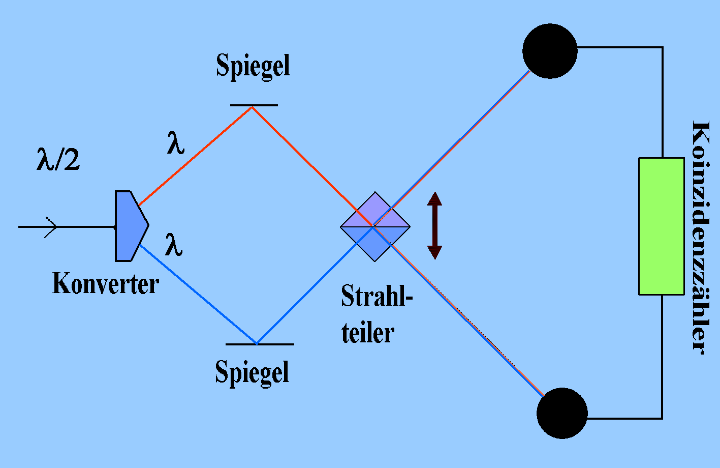 Zunächst handelt es sich um eine normale Anordnung zur Zwei-Teilchen-Interferenz (Photonenzwilling, Biphoton): Aus einem Konverter kommen zwei identische Photonen (mit gleicher Polarisation und Energie). Mit gleicher Wahrscheinlichkeit werden sie am Strahlteiler umgelenkt oder nicht. Den Strahlteiler verlassen zwei Strahlen, die die beiden Möglichkeiten überlagert enthalten. Es kommt zur Interferenz wegen der zwei klassisch denkbaren Möglichkeiten (oberer/unterer Weg vor dem Strahlteiler): Je nach den Abständen - veränderbar durch Bewegung des Strahlteilers in Pfeilrichtung - findet der Koinzidenzzähler Maxima und Minima, Zeichen der Interferenz, aber nicht der üblichen Einteilchen-Interferenz. Wenn die beiden Interferometer-Arme gleich lang sind, verschwinden die Koinzidenzen. Beide Photonen des Photonenzwillings erscheinen dann am gleichen Ausgang des Strahlteilers (vgl. das Experiment nach Hong, Ou und Mandel) |