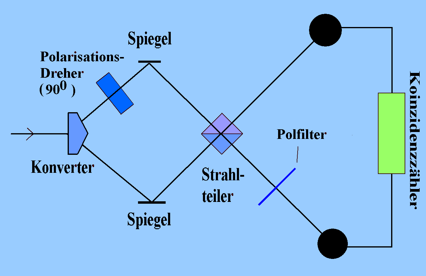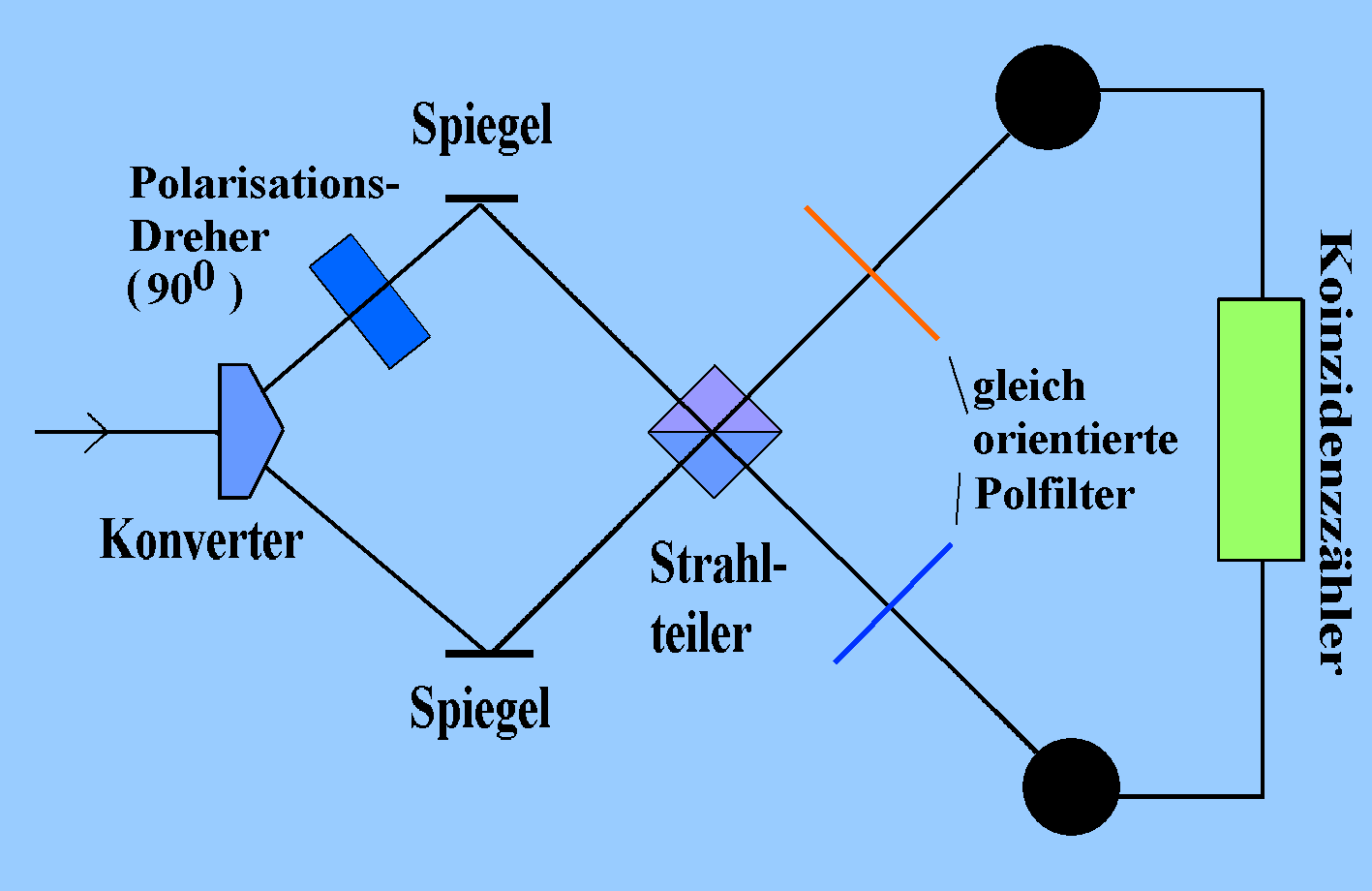 Stellt man einem der beiden Photonen einen Polarisations-Dreher in den Weg, der die Polarisationsrichtung um 900 dreht, so ist jetzt im Prinzip feststellbar, auf welchem Weg ein nachgewiesenes Photon in den Detektor gelangte: die Interferenz verschwindet. Durch ein Polarisationsfilter (kurz: Polfilter) zwischen einem Detektor und dem Strahlteiler könnte man nämlich entscheiden, ob das Photon den oberen oder den unteren Weg realisiert hat. Bei Ansprechen des betreffenden Detektors muss nämlich das Photon die Polarisationsrichtung des Polfilters und der Photonen auf dem jeweiligen Weg aus dem Konverter haben. |