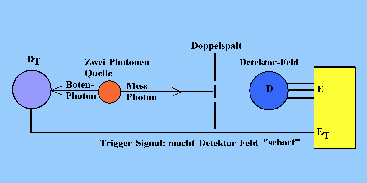 (3) Jedes einzelne Photon wird als Ganzes irgendwo auf dem Schirm registriert, an zufälligen Orten, vor allem in der Nähe der Maxima einer gedachten Interferenzfigur. Aber, wenn der Versuch sehr häufig wiederholt wird mit sehr viel Mess-Photonen aus der Zwei-Photonen-Quelle, baut sich so nach und nach eine Interferenzfigur aus lauter Einzelnachweisen auf. (4) Die Quelle muss räumliche Kohärenz garantieren und sie muss so klein sein, dass keine Aussage über den Weg des Mess-Photons aus dem Boten-Photon abgeleitet werden kann. Das Boten-Photon hat nur die Aufgabe, die Anwesenheit eines einzigen Mess-Photons in der Anordnung zu signalisieren. |