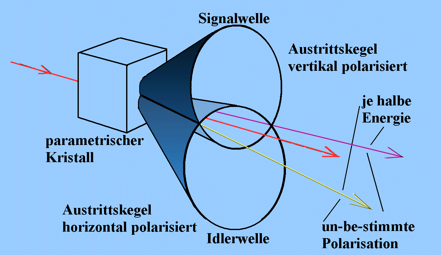 Die Kristallorientierung des doppelbrechenden (parametrischen) Kristalls soll so sein, dass zwei Doppelkegel mit unterschiedlichen Polarisationen entstehen. Im Kreuzungspunkt des gleichfarbigen Anteils überlagern sich die Zustände mit beiden Polarisationen (Polarisation un-be-stimmt). Das Photonenpaar liegt auf beiden Kegeln und verlässt den Kristall längs der violetten bzw. gelben Geraden. Bei einer Polarisationsmessung an einem der beiden Photonen ergeben sich zufallsgesteuert einmal die eine Polarisation, dann die andere. Dennoch: Wird links vertikale Polarisation gemessen, dann besteht rechts horizontale: Die beiden Photonen links wie rechts haben gleiche Energie und sind polarisationsmäßig stark korreliert. |