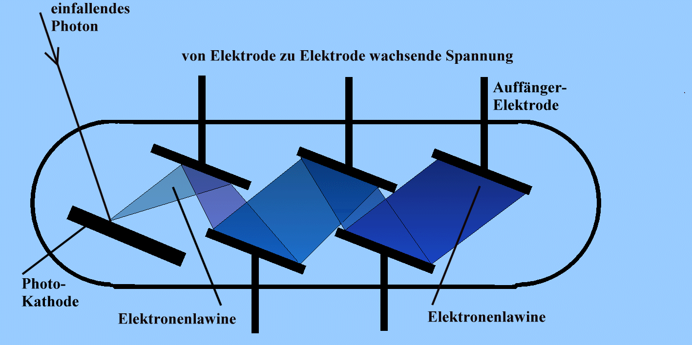In die hoch evakuierte Photomultiplier-Röhre sind mehrere Elektroden eingeschmolzen. Zwischen der Photokathode und ihnen wird eine von Elektrode (Anode) zu Elektrode (Anode) wachsende Spannung angelegt. Das zu detektierende Photon löst durch Photoeffekt in der Photokathode Elektronen aus, die zur nächsten Anode beschleunigt werden, aber ihrerseits beim Aufprall weitere Elektronen "herausschlagen". Das wiederholt sich von Anode zu Anode, so dass eine sich immer mehr verstärkende Elektronenlawine schließlich die Auffänger-Elektrode erreicht. Die Zahl der Elektronen in der Lawine ist dann so groß geworden, dass sie mit der verfügbaren Elektronik leicht nachgewiesen werden kann. Nachteil dieses Geräts ist, dass nicht jedes einfallende Photon zu einer Elektronenlawine führt.