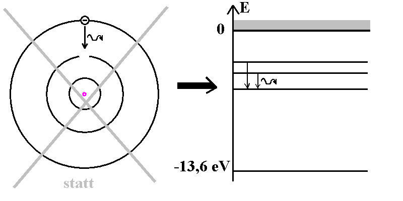 a) Das Atom hat feste Energiestufen En ; nur solche Energien sind erlaubt. b) Strahlung (Abgabe von Photonen) und Energieaufnahme (Aufnahme von Photonen) erfolgt nur durch Übergang von einer Energiestufe auf eine andere. Die Photonenenergie entspricht der Energiedifferenz. c) Das Elektron ist durch die Coulomb-Kraft an den Kern gebunden. d) Der Drehimpuls ist gequantelt, d.h. auch für ihn gibt es nur ganz bestimmte natürliche Zahlen n mit m·v·2·r·π = n·h, wobei n eine natürliche Zahl, oder auch: p·r = n·ħ wobei ħ = h/(2·π) |