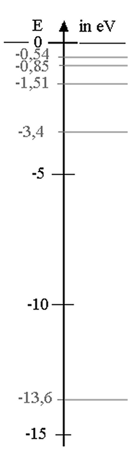 (5) Beim H-Atom ist es gleichgültig, ob man von Energiestufen des Elektrons oder des Atoms spricht. Bei Mehrelektronenatomen hat streng genommen nur das Atom diskrete Energiestufen. Nur in vereinfachten Näherungs-Modellen, z.B. dem Schalenmodell, tut man so, als haben auch die Elektronen selbst be-stimmte Energiestufen.