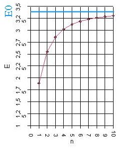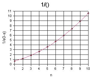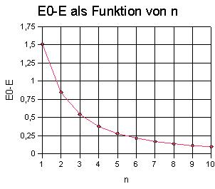 Abb. 3: E0 - E als Funktion von n strebt gegen 0 für n gegen unendlich. Es könnte sich um eine Hyperbel handeln, versuchsweise wird 1/(E0-E) gegenüber n aufgetragen. |