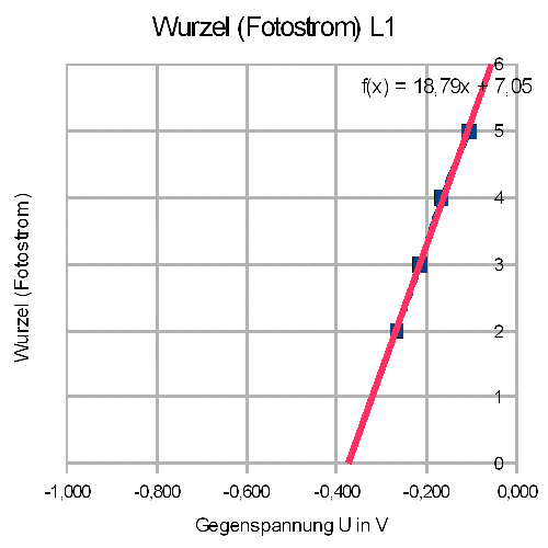 | Leuchtdiode L1 (f = 476 THz) Fotostrom f(x) = 0 => Ugrenz = - 7,05/18,79 V = -0,375 V