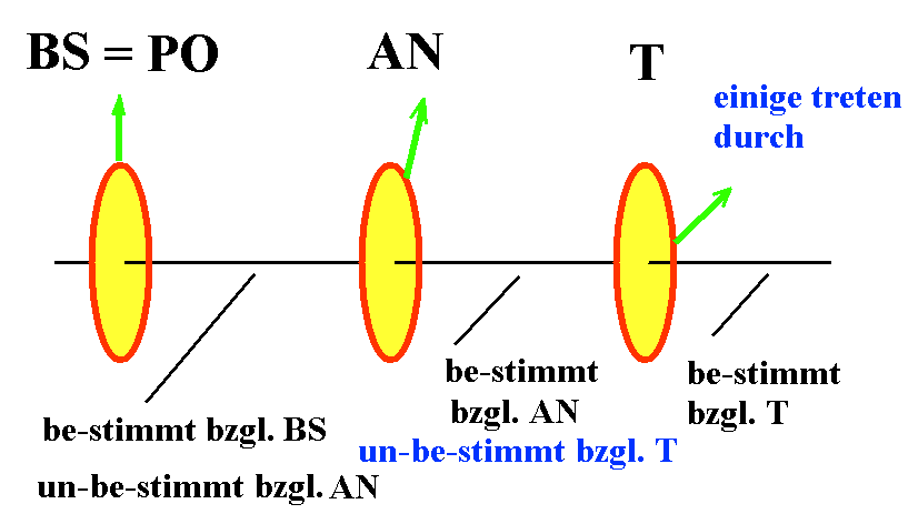 Das wird so interpretiert: Photonen mit be-stimmter Polarisation bzgl. BS haben un-be-stimmte Polarisation bzgl. AN. Es ist also un-be-stimmt, ob ein den Bildschirm verlassendes Photon den Analysator AN passieren wird oder nicht. Führt man eine Messung bzgl. AN durch, so kann die Messung einige Photonen mit be-stimmter Polarisation bzgl. AN liefern (deren Wahrscheinlichkeit hängt mit der klassischen Überlegung von Versuch 1 zusammen). Solche Photonen sind zugleich un-be-stimmt bzgl. T und BS. Es ist also un-be-stimmt, ob ein AN verlassendes Photon den Analysator T passieren wird oder nicht. Eine Messung bzgl. T kann deshalb einige Photonen mit be-stimmter Polarisation bzgl. T bzw. BS liefern. Es ist nicht vorhersagbar, welche Photonen das sein werden.
