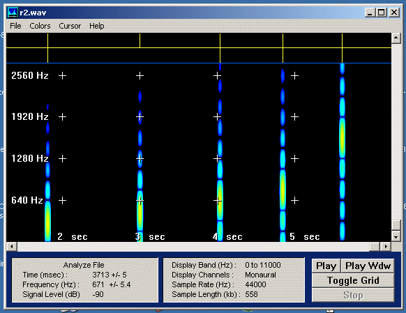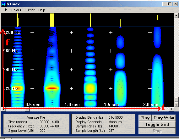Mit einem Programm wie GRAM.exe erstellen wir dann ein Sonogramm (Spektrogramm). Dabei gelten die Analogien:
