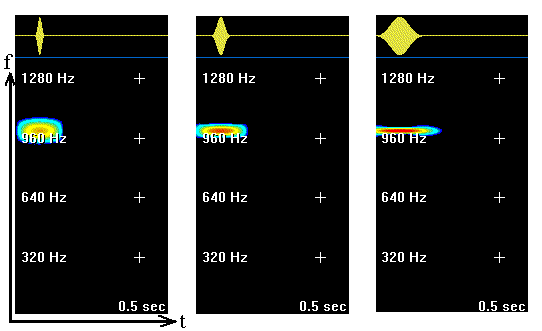 Hier wurden akustische Wellenpakete bei einer festen Grundfrequenz 1000 Hz mit GOLDWAVE rechnerisch erzeugt und mit GRAM wie links unten dargestellt (oberste Zeile) und darunter ausgewertet. GRAM erzeugt ein Sonogramm (Sonagramm oder Spektrogramm), bei dem beitragende Frequenzanteile f in Abhängigkeit von der Zeit t dargestellt werden.