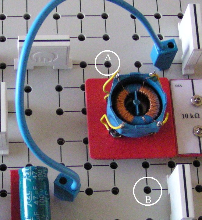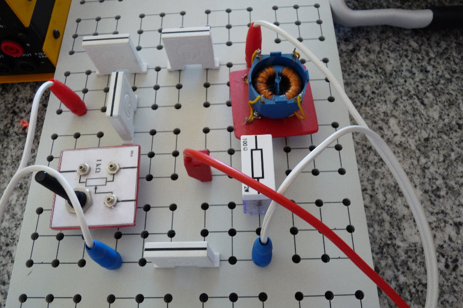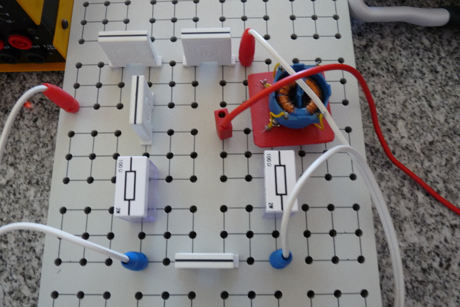 Leybold-Rastersteckplatte zur Erzeugung gedämpfter Schwingungen. Die Induktivität L und die Kapazität C lässt sich durch Umstecken der Bauteile leicht in Schritten vom Faktor 2 verändern. |