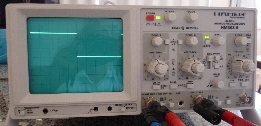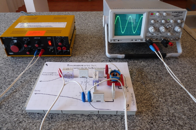 | Abb. 9: Erzwungene Schwingung; Erregerschwingung aus Funktionsgenerator mit beliebiger Kurvenform; Nachweis der erzwungenen Schwingunen durch ein Oszilloskop. Hier wird kapazitive Kopplung mit einem möglichst kleinen Kopplungskondensator (0,1 µF) verwendet (Vgl. Resonanzkurven beim Parallelschwingkreis). Anordnung an der Deutschen Schule Algarve. | |