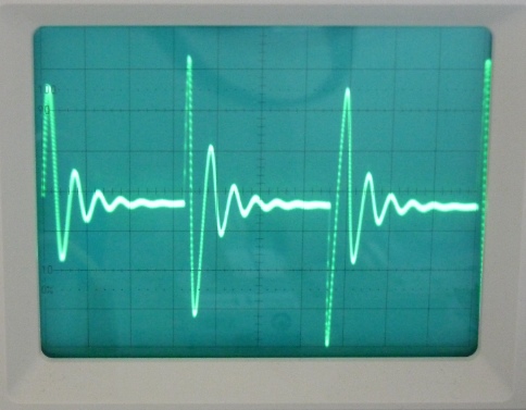 Anregung eines Schwingkreises mit C = 1 μF und der zweibeinigen Ferritdrossel (L = 0,15 H) mit einem 100 Hz-Rechteckssignal aus dem Funktionsgenerator. Wegen des deutlich höheren ohmschen Widerstands (ca. 200 Ohm) klingt die Schwingung deutlich schneller ab als in Abb. 7. Auch mit der Soundkarte lässt sich die Schwingungsdauer messen und nach L auswerten. |