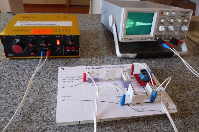 zur Erzeugung gedämpfter Schwingungen; Funktionsgenerator und Oszilloskop können durch ein Messinterface (z.B: FORPHYS mit AVISE) bzw. die Soundkarte des PCs ersetzt werden |