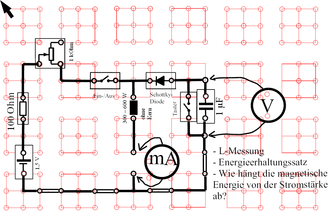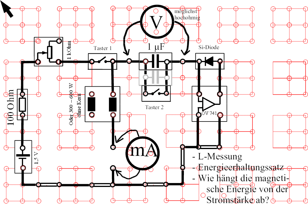 Es wird ein bekanntes Verfahren eingesetzt: Die magnetische Energie einer stromdurchflossenen Spule wird unter Ausnutzung der Induktion in die elektrische Energie eines Kondensators 1/2 · C · U2 umgewandelt (Abb. 2). Diese wird durch die entstehende Ladespannung U des Kondensators gemessen. a) Trägt man dann die Ladespannung U in Abhängigkeit vom Spulenstrom I auf entsteht eine Ursprungsgerade, aus der man abliest, dass die magnetische Energie in der gleichen Weise von der Stromstärke I abhängt wie die elektrische Energie von der Ladespannung U, also quadratisch. Die Proportionalitätskonstante wird unter Einfügung eines entsprechenden Faktors 1/2 als Induktivität L definiert: Emagn = 1/2 · L · I2 . b) Setzt man Energieerhaltung voraus, muss also gelten: 1/2 L · I2 = 1/2 C · U2 bzw. L = C · (U/I)2 . Damit hat man eine relative Messung von L, deren Genauigkeit im wesentlichen durch die Genauigkeit der C-Kenntnis bestimmt ist. Allerdings gibt es Einwände: Ohmsche Widerstände sorgen für Energie-Verluste, insbesondere in der Spule, aber auch in der Diode. Die Diode selbst sperrt weitgehend unter einer bestimmten Knickspannung (Si: ca. 0,6 V, Schottky-Diode ca. 0,15 - 0,3 V; eine Ge-Diode erscheint günstiger). Gängige Ge-Dioden sind aber für Stromstärken von typisch maximal 5 mA ausgelegt. Beachtet man dies, kann man mit Ge- oder Schottky-Dioden schon recht brauchbare Ergebnisse erzielen (Abb. 3). In der I-U-Kennlinie erkennt man allerdings das Abschneiden unterhalb der Knickspannung. Das kann in vielen Fällen verkraftet werden. Bessere Ergebnisse erhält man mit einem Präzisisionsgleichrichter mit einer Operationsverstärker-Schaltung (Abb. 2, 4) . Hier sind I und U wirklich proportional zueinander. (In der Abbildung ist eine primitive Eigenbauvariante für den OV verwendet. Man sollte lieber einen kommerziellen Operationsverstärker-Baustein aus dem Lehrmittelhandel verwenden. Für die Leybold-Rastersteckplatte werden Auflageblätter verwendet, die einen sicheren, leicht kontrollierbaren und übersichtlichen Schaltungsaufbau ermöglichen.) |