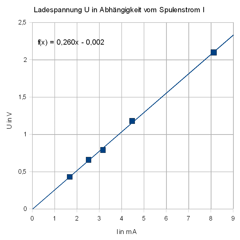 Sie zeigt: 1. Die magnetische Energie in der stromdurchflossenen Spule hängt in der gleichen Weise von der Stromstärke ab wie die elektrische Energie des Kondensators von der Ladespannung, die sich einstellt, wenn die magnetische Energie vollständig in die elektrische Energie des Kondensators übergeführt wird. Also: Wegen Eel prop U2 gilt auch Emagn prop I2. Die Proportionalitätskonstanten sind C/2 bzw. L/2. 2. Aus der Steigung 0,26 V/mA = ΔU/ΔI = U/I wird hier geschlossen: L/C = 0,262 V2/mA2 = 0,0676 V2/mA2 = 0,0676·106 V2/A2 Bei C = 2·10-6 F folgt also L = 2·0,0676 H = 0,135 H |