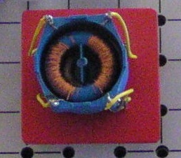 | Abb. 1: Spulenbaustein aus einer stromkompensierten Drossel, die auf ein Plättchen mit 4 Stück 4-mm-Steckern montiert wurde, geeignet zum Aufstecken auf die Leybold-Rastersteckplatte | Allerdings muss man in Kauf nehmen, dass wegen des Ferritkerns L nicht unbedingt konstant ist, wie man das bei einer Luftspule erwartet. Wegen der besonderen Hysteresis-Kurve gelingen Induktionsversuche nicht in jedem Fall so, wie man es in der Schule gerne hätte. |