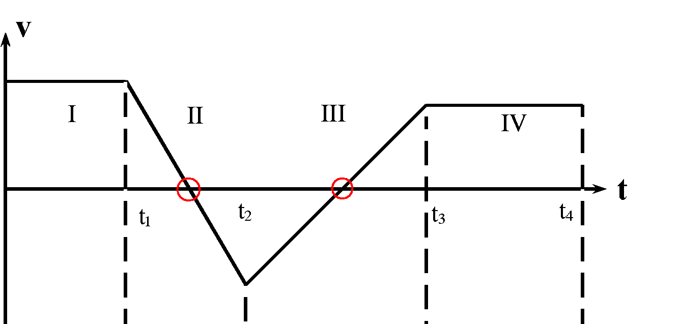 Im Abschnitt II ist die Beschleunigung konstant negativ. Von der Zeit t1 aus wird dabei das Fahrzeug offenbar zuerst bis zum Stillstand abgebremst (roter Kreis), dann wieder schneller. Bei t2 erreicht es seine kleinste (negative) Geschwindigkeit und ist dort gleichzeitig am schnellsten (maximales Tempo; im Vergleich zu benachbarten Zeiten). Ähnlich steigt im Abschnitt III die Geschwindigkeit gleichmäßig an mit konstanter positiver Beschleunigung. Dennoch wird das Fahrzeug zunächst bis zum Stillstand abgebremst (roter Kreis) und dann erneut schneller, bis es bei t3 die größte Geschwindigkeit und das größte Tempo erreicht. |