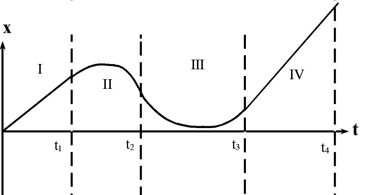 Gegebener t-x-Graph. Es sind hier 4 Bereiche markiert. In den Bereichen I und IV liegt eine gleichförmige Bewegung vor, in den Bereichen II und III eine beschleunigte Bewegung, vielleicht sogar eine gleichmäßig beschleunigte. |
