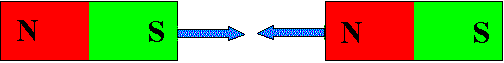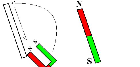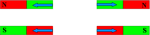 | Gleichnamige Magnetpole (N und N; S und S) stoßen sich gegenseitig ab. Ungleichnamige Magnetpole (N und S) ziehen sich gegenseitig an. |