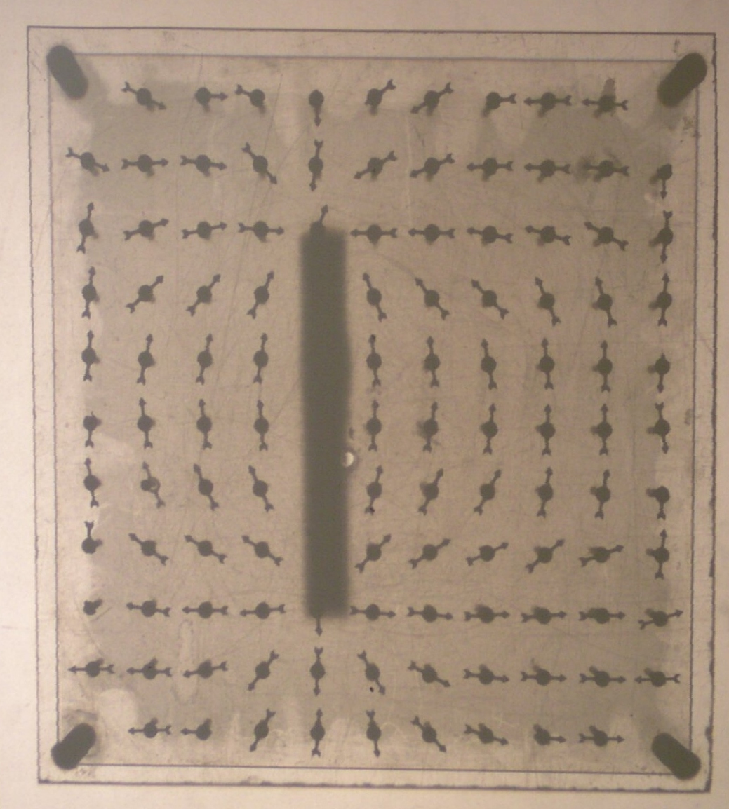 Faraday versuchte Strukturen der Kraftwirkung um einen Magneten zu erkennen und streute in seine Umgebung feine Eisenspäne (weil diese durch Abfeilen von einem größeren Eisenblock entstanden, nennt man sie oft Eisenfeilspäne). Das kannst du sogar im Schülerversuch wiederholen. Du findest interessante Strukturen.