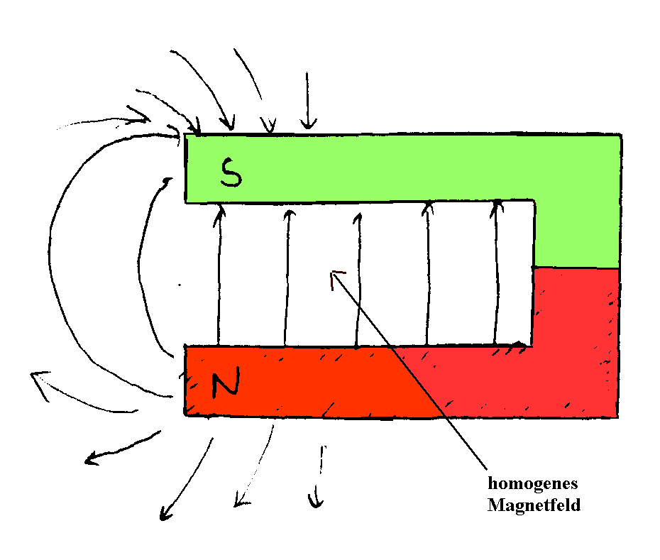 eines Hufeisenmagneten, nicht nur zwischen ihnen, schematisch.