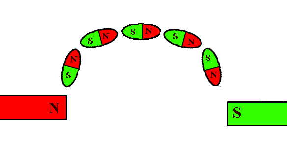 Bringe eine magnetisierte Stricknadel an einem Schwimmer aus Kork oder Styropor an, der in einem Wassertank schwimmt. Der eine Pol soll bis tief unter die Wasseroberfläche reichen, der andere Pol, sagen wir, der N-Pol, soll nahe der Wasseroberfläche sein. Bringst du jetzt auf der Höhe der Wasseroberfläche einen starken Magneten an, schwimmt der N-Pol des Schwimmers auf einer gekrümmten Kurve vom N-Pol des Magneten weg zu seinem S-Pol.