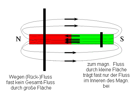 Außerhalb des Magneten verläuft das magnetische Feld (B) längs der Feldlinien von N nach S, innerhalb dann von S nach N weiter. Das hat Konsequenzen, wenn es um die "Menge an Magnetfeld" geht, die z.B. eine geschlossene Leiterschleife durchsetzt, wie es bei der Induktion der Fall ist. Der Fachbegriff dafür ist "magnetischer Fluss". Der "innere" magnetische Fluss wird dann teilweise kompensiert durch den gegenläufigen "äußeren" Rückfluss. Bei weiten Induktionsschleifen ist dann die Induktion geringer als bei engen, die nur den "inneren" Fluss umfassen.
