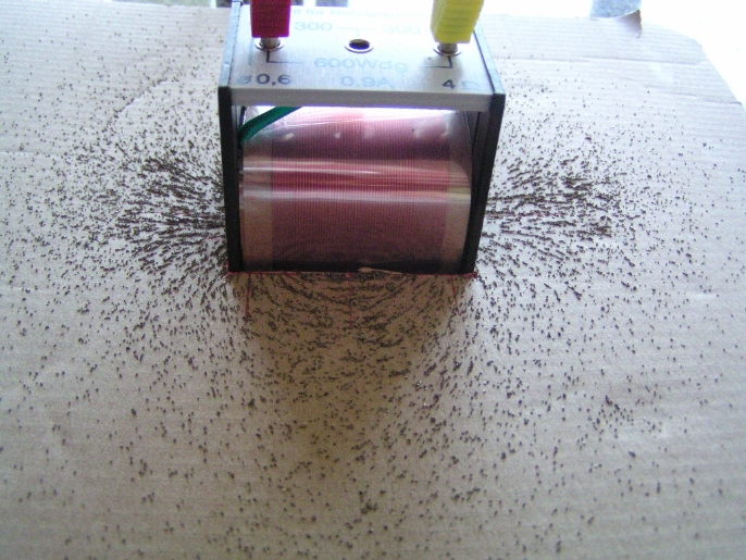Auch bei einer stromdurchflossenen Spule bilden die Eisenfeilspäne Ketten, die im Außenbereich geschlossen werden. |