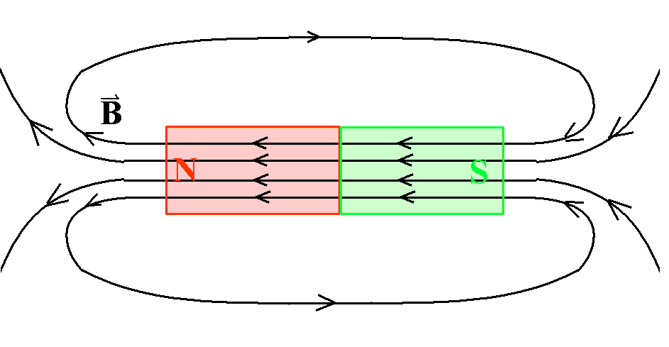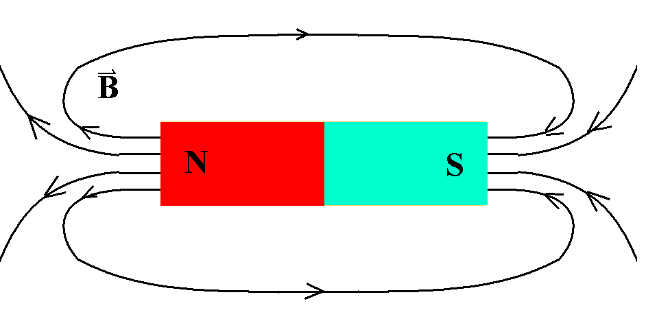 | Das Magnetfeld B verläuft außerhalb eines Magneten längs einer Feldlinie vom N- zum S-Pol. (In seinem Inneren läuft es dann weiter vom S- zum N-Pol.) |