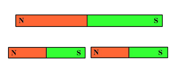 Wie klein auch die Stücke sein mögen, die wir durch Zerbrechen des Drahtes erreichen, immer hat jedes Stück einen N- und einen S-Pol. Das gilt für alle Drahtstücke, solange sie ferromagnetisch sind (das ist an eine gewisse Größe des Stücks gebunden und an die Tatsache, dass es im festen Aggregatszustand ist.) Aber selbst einzelne Eisenatome können magnetisch sein. Sie können aber nicht weiter unterteilt werden ohne den Magnetismus zu zerstören bzw. völlig zu verändern. |